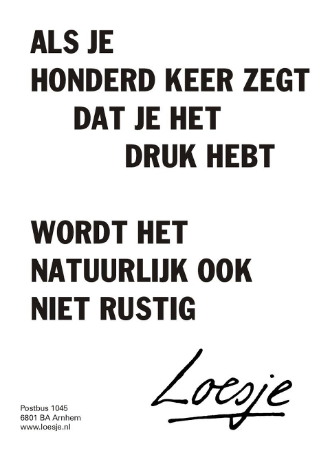 En…. Ik doe er zelf net zo hard aan mee! Naast het harde werken voor mijn baan en studie wil ik ook graag ‘de allerliefste mama van de hele wereld zijn’. Als stiefmoeder wil ik het ook goed doen. Ik wil een liefdevolle en zorgzame echtgenote zijn, een betrouwbare vriendin en een liefhebbende dochter en zusje. Oh ja, gezond leven, sporten en af en toe tijd voor mezelf vind ik eigenlijk ook belangrijk. Maar dat laatste schiet er vaak bij in. Toen we nog geen 20 waren, en het was mooi weer, waren er genoeg mensen te vinden die een terrasje konden pakken. Maar nu we wat ouder worden, vinden mensen het kennelijk niet meer cool om niets te doen te hebben, en is opeens iedereen 'druk', en mensen die niet druk zijn, doen alsof ze het druk hebben.