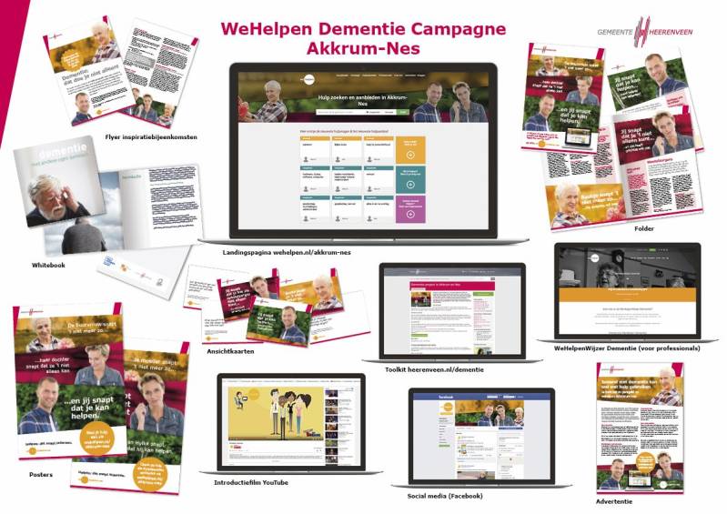 Alle organisaties, winkels etc. uit Akkrum en Nes ontvingen een toolkit per post. De toolkit bestaat uit folders, posters en ansichtkaarten die zij mee kunnen geven aan cliënten of patiënten die te maken hebben met dementie. Met het materiaal kunnen zij helpen om het project en de website wehelpen.nl/akkrum-nes zo bekend mogelijk te maken onder de inwoners van Akkrum en Nes. Inwoners ontvangen een folder in de bus met de boodschap: ‘jij snapt dat je kan helpen’.